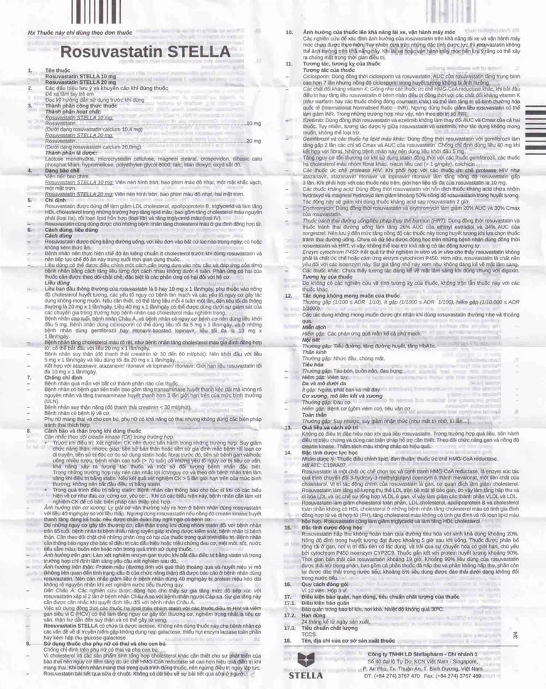 Rosuvastatin STELLA 10mg của Công ty TNHH LD Stellapharm – Chi nhánh 1, thành phần chính là rosuvastain 10 mg, là thuốc điều chỉnh lipid, đơn thuần; thuốc ức chế HMG-CoA reductase.