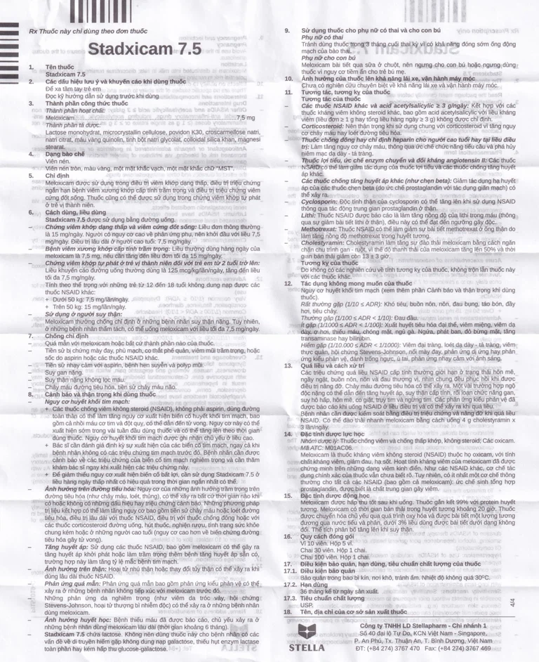 Ảnh hưởng huyết học: Bệnh thiếu máu đã được báo cáo, chủ yếu xảy ra ở những bệnh nhân dùng meloxicam lâu dài (thời gian khoảng 6 tháng). Stadxicam 7.5 chứa lactose. Không nên dùng thuốc này cho bệnh nhân có các vấn đề về di truyền hiếm gặp không dung nạp galactose, thiếu hụt enzym lactase