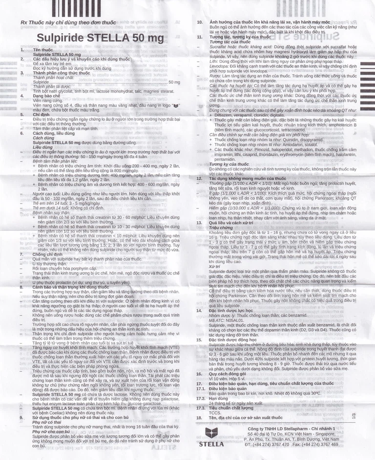 Thuốc Sulpiride STELLA 50mg có thành phần chính Sulpirid giúp điều trị chứng lo âu ở người lớn trong trường hợp thất bại với các điều trị thông thường. Tâm thần phân liệt cấp và mạn tính.