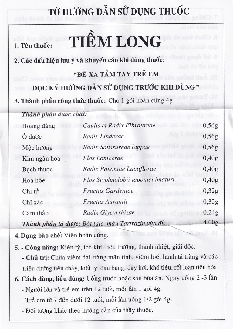 Tiềm long của Công ty TNHH Đông Nam Dược Bảo Long, thành phần chính là hoàng đằng, ô dược, mộc hương, kim ngân hoa, bạch thược, hoa hòe, chi tử, chỉ xác, cam thảo. Tiềm long là thuốc điều trị viêm đại tràng mãn tính, viêm loét hành tá tràng và các chứng tiêu chảy, kiết lỵ, đau bụng, đầy hơi, khó tiêu, rối loạn tiêu hóa.
