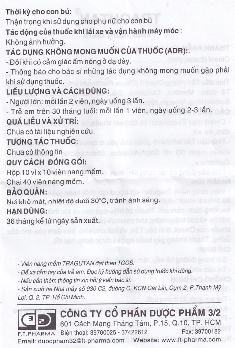 Viên nang mềm Tragutan với các dược chất hoàn toàn thiên nhiên, có tính sát khuẩn đường hô hấp, hạ sốt, được dùng điều trị các chứng ho, long đàm, cảm sốt. Thuốc có hiệu quả cao và tức thời, làm dịu các cơn ho và các triệu chứng khó chịu của cảm cúm do kết hợp tính kháng khuẩn của cineol, tinh dầu Tần và tính chữa ho, tiêu đàm của tinh dầu Gừng.