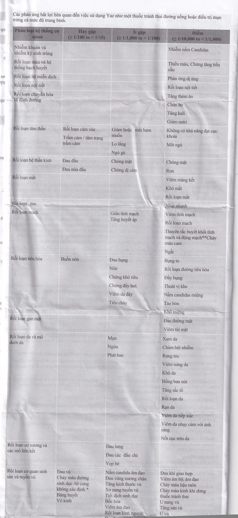 Cơ quan sinh sản và tuyến vú: Nấm candida âm đạo, đau vùng xương chậu, tăng kích thước vú, xơ nang tuyến vú, tiết dịch sinh dục, bốc hỏa, viêm âm đạo rối loạn kinh nguyệt, đau bụng kinh, thiểu kinh, rong kinh, khô âm đạo, kết quả pap smear nghi ngờ có bất thưòng.