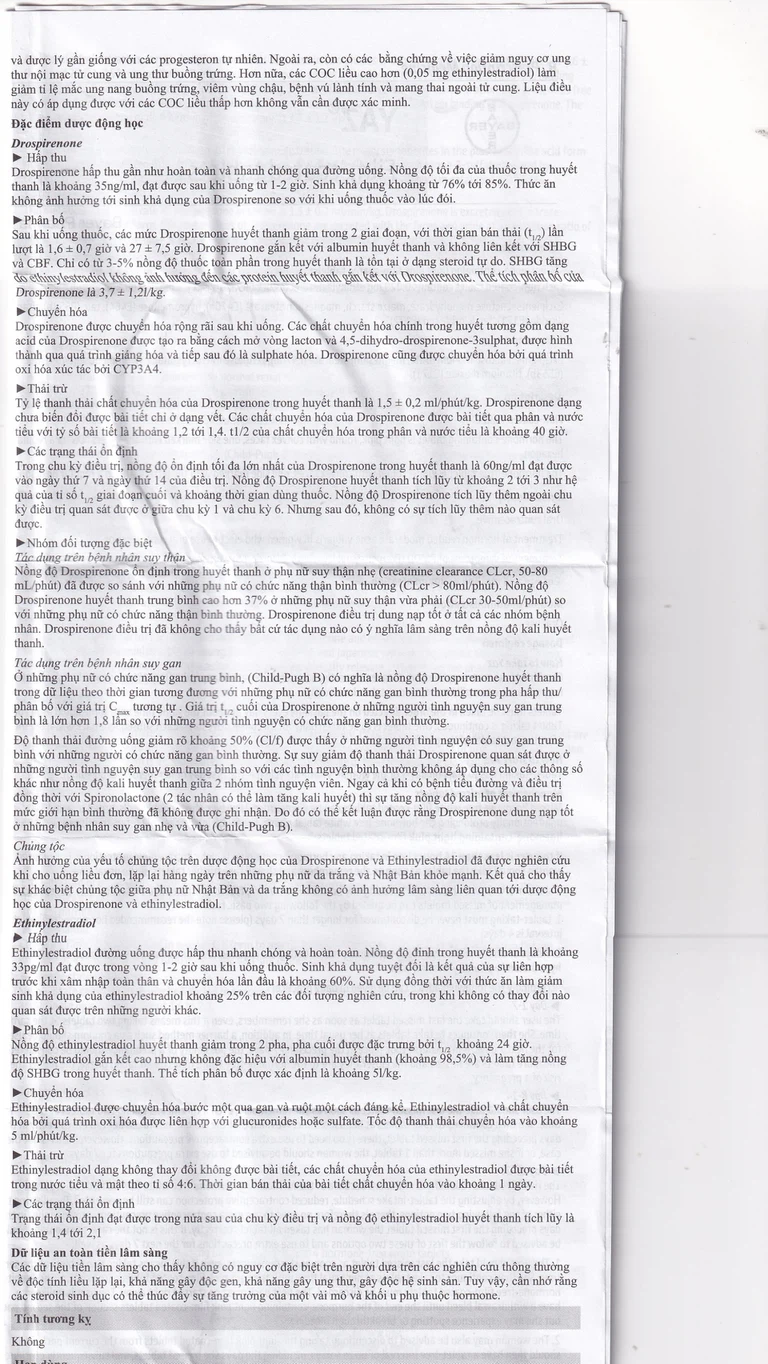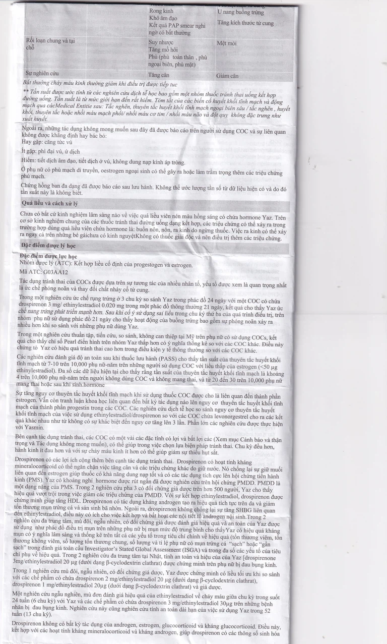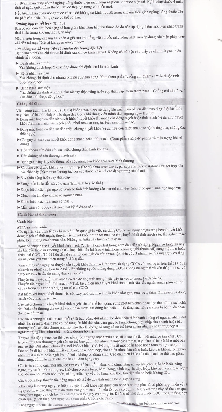 Bệnh nhân cao tuổi: Yaz không thích hợp. Yaz không được chỉ định sau khi mãn kinh.