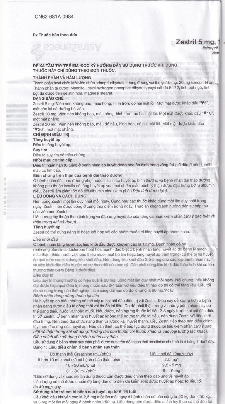 Bệnh nhân suy thận (độ thanh thải creatinin < 80 ml/phút), liều khởi đầu Zestril nên được điều chỉnh theo thông số này.