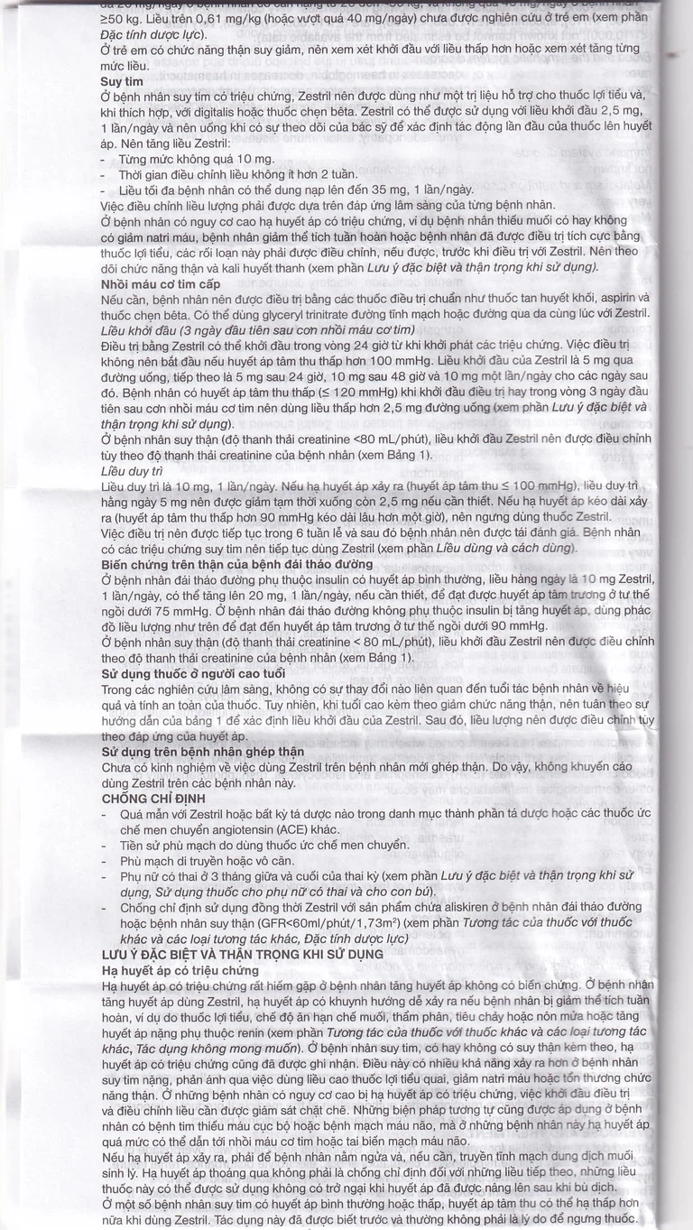 Ở bệnh nhân suy tim có triệu chứng, Zestril được dùng hỗ trợ cho thuốc lợi tiểu, digitalis hoặc thuốc chẹn beta. Liều khởi đầu của Zestril là 2,5 mg x 1 lần/ngày. Nên tăng liều Zestril từng đợt không quá 10 mg, thời gian điều chỉnh không ít hơn 2 tuần và liều tối đa dung nạp lên đến 35 mg x 1 lần/ngày. Việc chỉnh liều dựa trên đáp ứng lâm sàng của bệnh nhân.