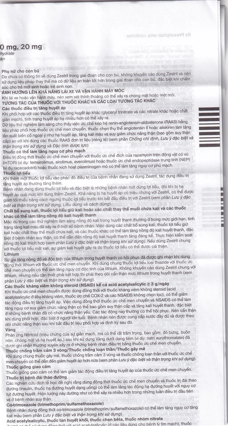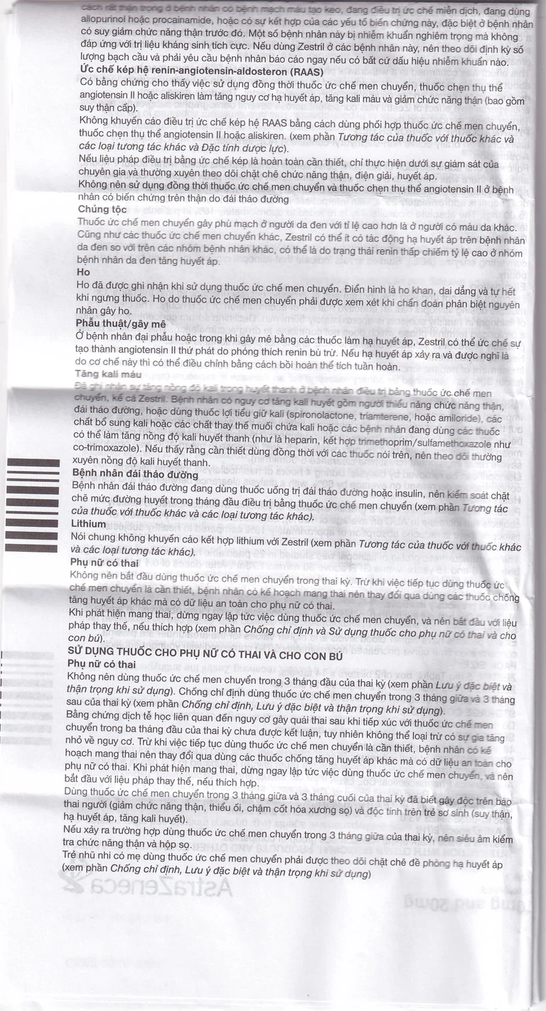 - Quá mẫn với Zestril hoặc bất kỳ tá được nào hoặc các thuốc ức chế men chuyển angiotensin (AE) khác.