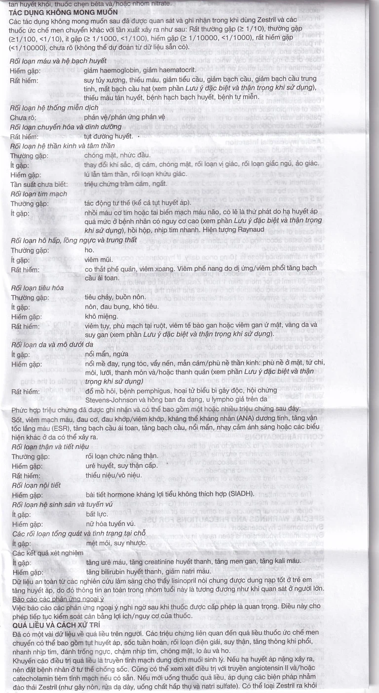 Thuốc ức chế men chuyển có thể liên quan đến hội chứng khởi đầu là vàng da ứ mật và tiến triển thành hoại tử bạo phát và đôi khi gây tử vong. Nên ngưng dùng thuốc ở bệnh nhân xuất hiện triệu chứng vàng da hoặc tăng men gan rõ rệt khi dùng Zestril và có sự theo dõi của bác sỹ.