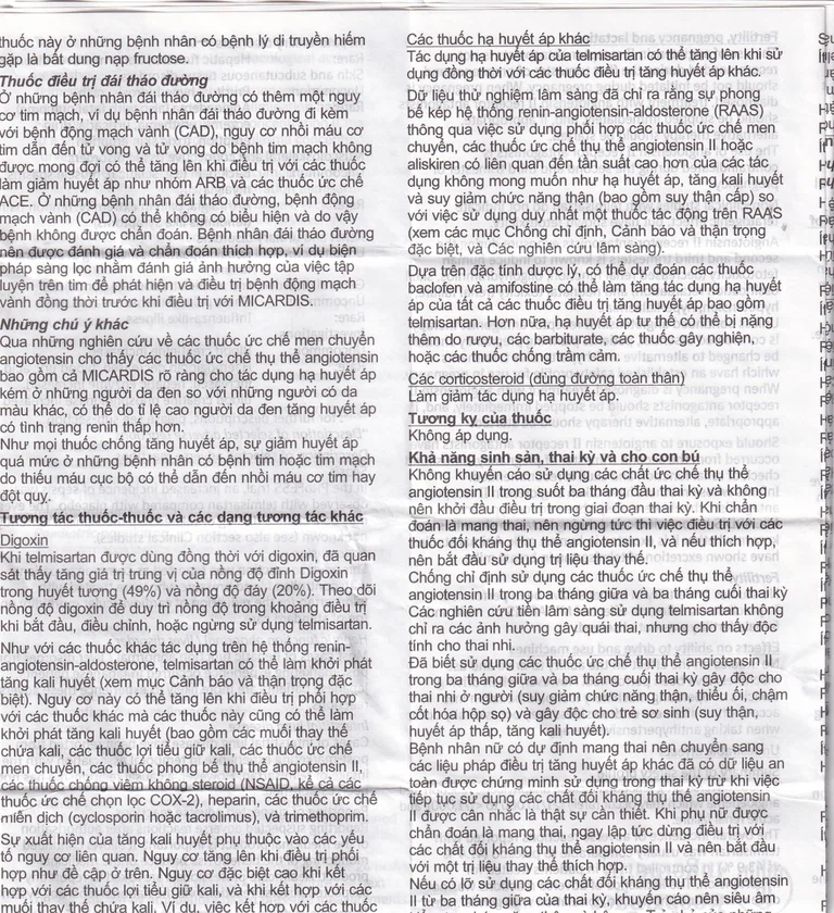 Khuyến cáo theo dõi lượng kali huyết thanh ở bệnh nhân có nguy cơ. Dựa trên kinh nghiệm sử dụng thuốc ảnh hưởng trên hệ renin – angiotensin – aldosterone, việc dùng phối hợp với các thuốc lợi tiểu giữ kali, bổ sung kali, muối thay thế chứa kali hoặc những thuốc khác mà có thể làm tăng nồng độ kali (heparin…), có thể làm tăng kali huyết thanh, do đó cần chú ý khi dùng chung các thuốc này với Micardis.