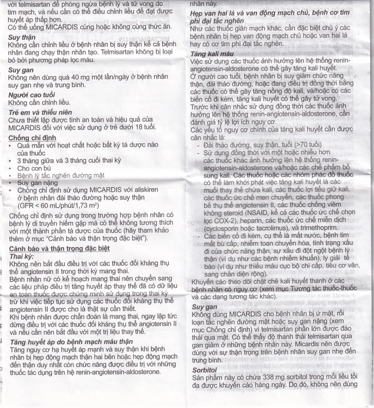 Suy thận và ghép thận: Cần theo dõi định kỳ nồng độ kali và creatinine huyết thanh khi dùng Micardis ở bệnh nhân suy thận. Không có kinh nghiệm sử dụng Micardis ở bệnh nhân mới ghép thận.