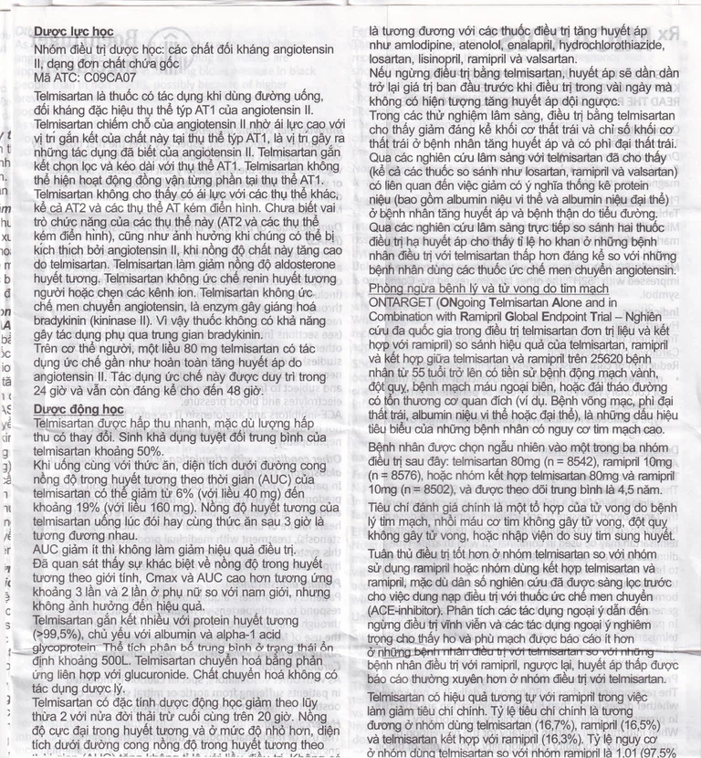 Trong một nghiên cứu dùng kết hợp telmisartan với ramipril dẫn tới tăng 2,5 lần AUC0-24 và Cmax của ramipril và ramiprilate. Chưa biết được liên quan lâm sàng của quan sát này.