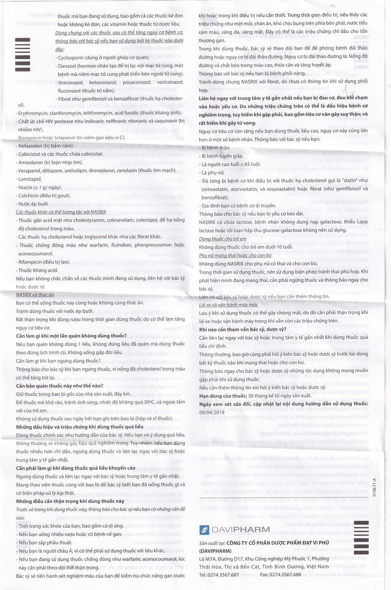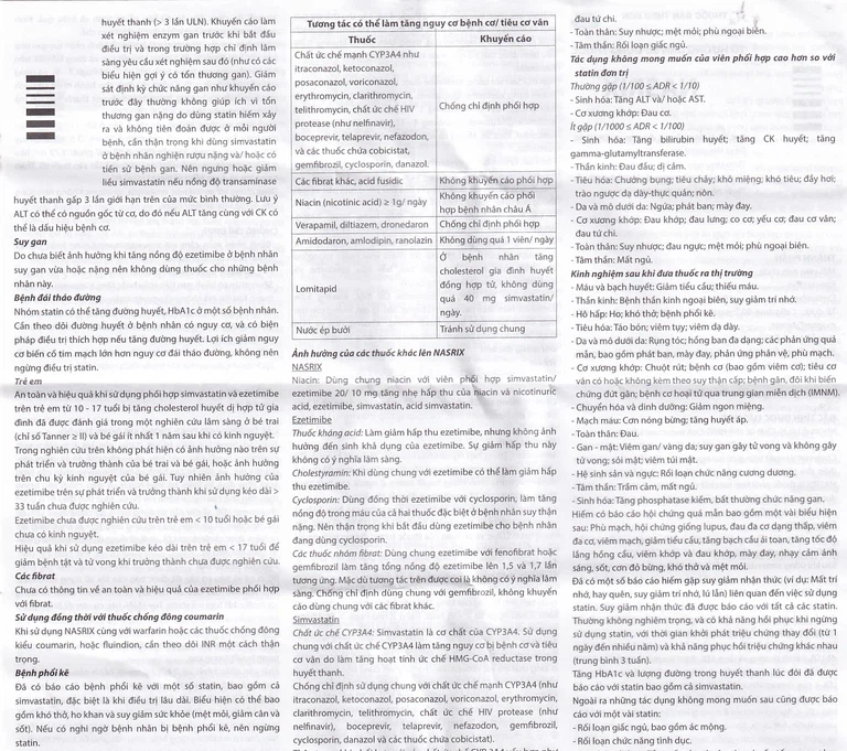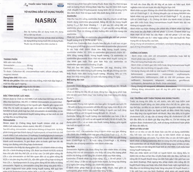 Viên Nasrix là dạng viên kết hợp chứa simvastatin 20mg/ezetimibe 10mg, được sử dụng để thay thế viên simvastatin 20mg và ezetimibe 10mg riêng lẻ hoặc được dùng để phối hợp thêm ezetimibe khi điều trị bằng simvastatin 20mg không đạt được mục tiêu điều trị. Nasrix không thích hợp với chỉ định điều trị với liều lượng khác.