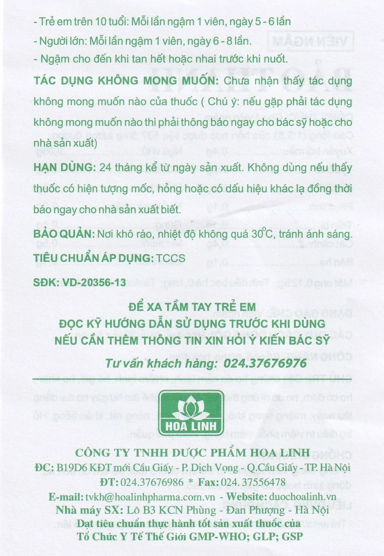 Viên ngậm Bảo Thanh Hoa Linh bổ phế, trừ ho (20 vỉ x 5 viên)