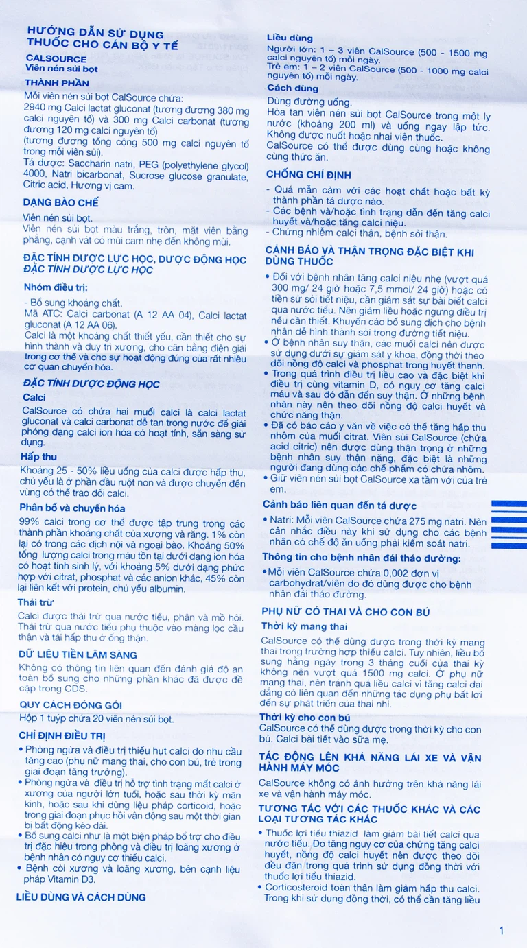 - Mỗi viên Calsource chứa 0,002 đơn vị carbohydrat/viên do đó dùng được cho bệnh nhân đái tháo đường.