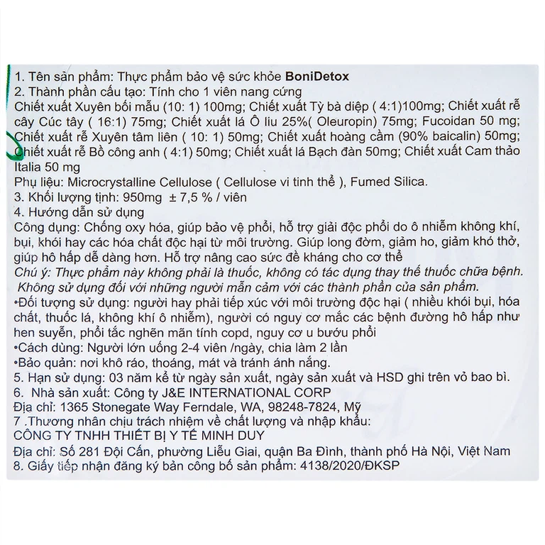 BoniDetox chứa các thảo dược long đờm, giãn phế quản, giúp giảm ho, đờm, khó thở.